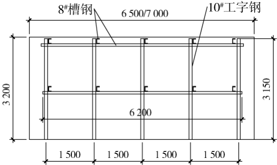为保证山顶承台施工质量及安全,采用型钢钢筋支架的方式解决钢筋支撑问题,钢筋支架采用10#工字钢及8#槽钢2 种槽钢焊接的形式。钢筋支架立杆采用10#工字钢,立杆间距不得大于2 m,钢筋支架横杆采用8#槽钢,横杆间距为1.5 m。根据承台选型,将钢筋支架分为承台选型一钢筋支架、承台选型二钢筋支架及承台选型三钢筋支架3 种,再根据承台高度分为2.2 m、2.8 m、3.2 m等3 种(图3)。