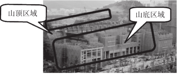 背景工程结构分为山顶区域与山底区域2 部分,5~19轴山底结构施工至8层(标高:+57.95 m)架设转换梁至山顶区域,1~5轴及19~23轴山底结构施工至9层(标高:+64.95 m)架设转换梁至山顶区域,见图1。
