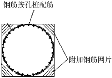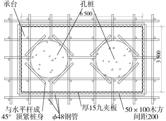 为了简化施工工艺,加快施工进度,高出土面以上的孔桩由圆形截面变更为方形截面(图2),并采用普通模板支撑体系进行模板加固,此法不仅施工周期短、操作简单,而且降低了施工成本。孔桩变截面模板支撑设置要点: