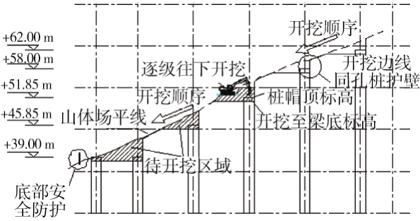 根据本工程坡顶P~U轴区域相关图纸,多处地梁标高均在现场地坪孔口标高以下,导致后期地梁施工时,需对该区域土方进行开挖。由于P~U轴、23轴区域开挖高度将达到6 m左右,故此区域土方需分级开挖(图6),每级开挖深度为2~3 m,部分区域山体较陡,为满足挖机下到开挖面,需进行部分填方。开挖出的土方需由人工运送至道路上汽车所能到达的弃土区,然后通过汽车将弃土运出。