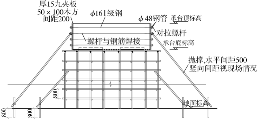 本工程山顶某区域为一山涧,该部位承台有4 个承台底标高均高出现场地面标高,无法按照传统的办法进行承台模板的安装。对于承台模板支设困难的问题,本工程采用钢管架体支设承台模板,参数如下(图4、图5):