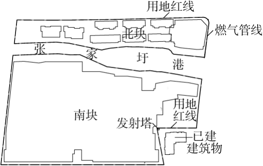 某工程主要为低层住宅,分南北2 块,地下整体设置1 层地下车库。基坑总面积约40 000 m2,基坑周长约1 280 m,开挖深度约4 m。基坑周边环境普遍较简单,但南块基坑东南角紧邻用地红线有一座中国联通通信基站发射塔,北块基坑东侧紧邻用地红线有1 根燃气管线。发射塔高逾30 m,为高耸结构,主体为钢桅杆结构,塔基基础为钢筋混凝土板,埋深约0.5 m,距离基坑边线最近仅1.9 m。最近的燃气管线距离基坑边线也仅2.3 m(图1)。