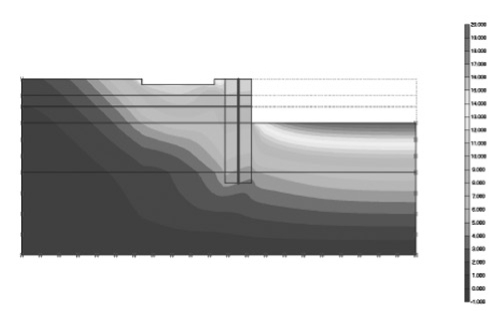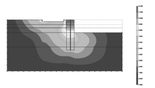 通过数值模拟分析,得出最危险工况下土体及围护结构的内力和变形情况。计算结果显示,当基坑开挖至基底时,围护结构最大水平位移24 mm,发射塔塔基最大位移12 mm,表明本工程基坑开挖对周边环境的变形影响可控制在其允许的范围之内。图3~图6给出了有限元计算的主要计算结果。