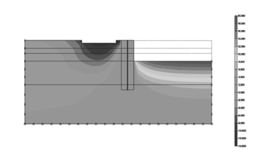 根据工程地质勘查报告,本场地属于澙湖沼泽平面地貌类型。从地基土层的力学参数来看, 土质条件一般,并且场地内分布多条暗浜。地下车库开挖所影响到的地层主要为黏土层和粉质黏土层。