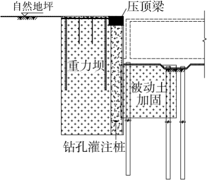 后者水泥土搅拌桩重力坝一方面起止水帷幕作用, 另一方面利用搅拌体本身强度起一定的支护作用, 使土体对灌注桩作用力位置降低, 并减少灌注桩的悬臂高度, 使其受力更趋合理[1-3]。