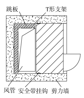 针对此种情况,空调立管与竖井间距离过小,井内搭设井字脚手架进行立管安装无法实现,经过现场实际勘察,最终确定风管安装的位置。其中,风管长边距离楼板边50 mm,风管另一长边距离剪力墙边250 mm;风管短边距离另外两边剪力墙一边为250 mm、另一边为150 mm。按这一标准对风管进行定位,可以满足1 名或2 名体型较小操作人员从250 mm一边进入竖井进行施工操作。结构竖井平面如图1所示。
