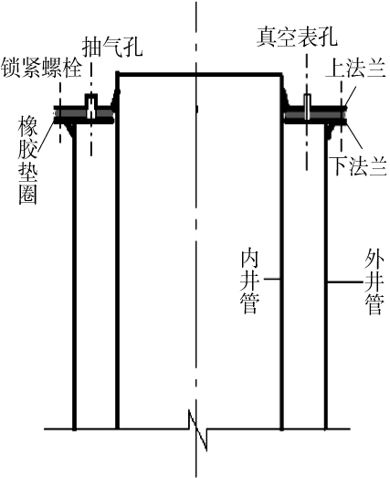井口密封采用法兰+密封垫,法兰包括上法兰和下法兰,上、下法兰为厚15 mm环形钢板,上面开设有抽气孔和真空表孔;上法兰与内径200 mm、壁厚3 mm的内管连为一体,下法兰与内径273 mm、壁厚4 mm的外管连为一体,连接方式为焊接。上下法兰之间采用橡胶垫圈密封,并预留真空泵接口和真空计接口。如图2所示。