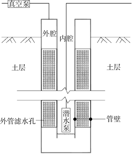 低渗透性黏土层超真空双管疏干井将井管降水结合真空技术,采用双管构成内、外腔,内腔顶部开放,外腔密封保持高真空状态,低渗透性黏土地层与外腔形成压力差,加速土层中的水向外腔渗透,通过内、外腔的真空泵、潜水泵排出(图1)。