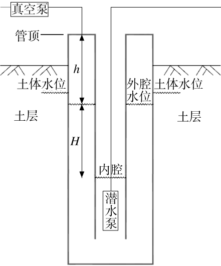 因此,为达到外管保持持续较高的真空度,且有利于土体里的水向外管内渗透,需保持真空度,使形成的内外管压力差∆h<H+h,且保持外腔水位低于土体水位。