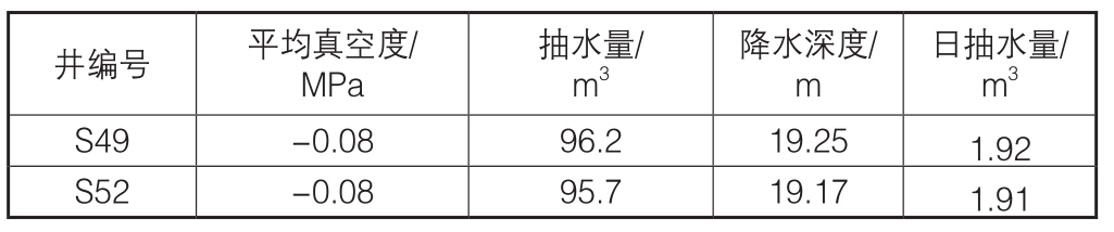 井编号 平均真空度/MPa日抽水量/m3 S49 -0.08 96.2 19.25 1.92 S52 -0.08 95.7 19.17 1.91抽水量/m3降水深度/m