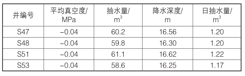 井编号 平均真空度/MPa日抽水量/m3 S47 -0.04 60.2 16.56 1.20 S48 -0.04 59.8 16.30 1.20 S51 -0.04 61.1 16.62 1.22 S53 -0.04 58.6 16.25 1.17抽水量/m3降水深度/m