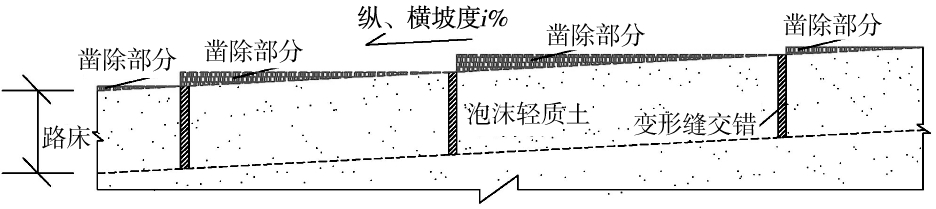 金属网应跨过施工缝或变形缝位置连续铺设,在平面上形成整体。当分区浇筑至路床顶面时可对路床顶面进行纵横坡设置,由低处向高处凿除多余的泡沫轻质土,使之形成滑顺、符合设计要求的纵横坡面,如图4所示。