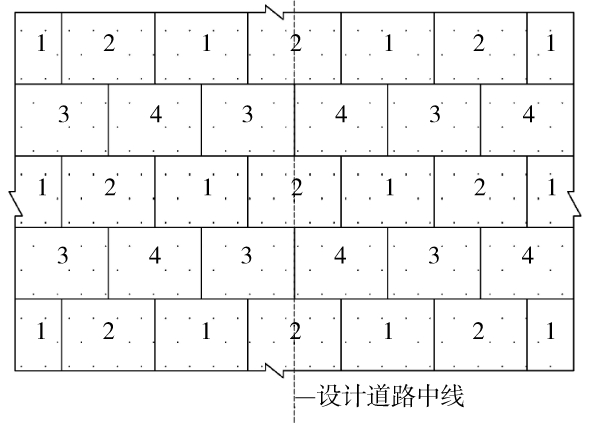 为减少路面产生工后通缝,采用错缝跳仓现浇技术,如图3所示,泡沫轻质土浇筑顺序为1→2→3→4。当浇筑第2层时应错开第1层纵、横向施工缝,这样就形成错缝跳仓现浇施工技术。