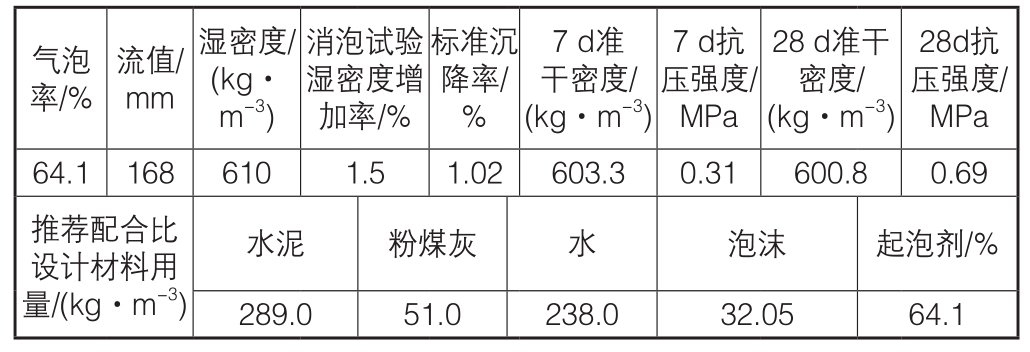 28d抗压强度/MPa 64.1 168 610 1.5 1.02 603.3 0.31 600.8 0.69推荐配合比设计材料用量/(kg·m-3)气泡率/%流值/mm湿密度/(kg·m-3)消泡试验湿密度增加率/%标准沉降率/%7 d准干密度/(kg·m-3)7 d抗压强度/MPa 28 d准干密度/(kg·m-3)水泥 粉煤灰 水 泡沫 起泡剂/%289.0 51.0 238.0 32.05 64.1