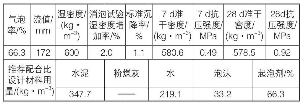 28d抗压强度/MPa 66.3 172 600 2.0 1.1 580.6 0.49 578.5 0.92推荐配合比设计材料用量/(kg·m-3)气泡率/%流值/mm湿密度/(kg·m-3)消泡试验湿密度增加率/%标准沉降率/%7 d准干密度/(kg·m-3)7 d抗压强度/MPa 28 d准干密度/(kg·m-3)水泥 粉煤灰 水 泡沫 起泡剂/%347.7 —— 219.1 33.2 66.3