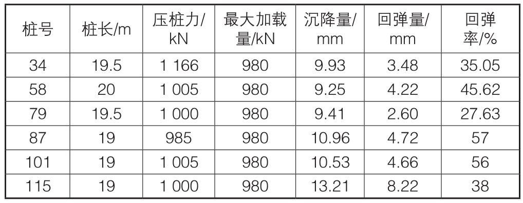 桩号 桩长/m 压桩力/kN回弹率/%34 19.5 1 166 980 9.93 3.48 35.05 58 20 1 005 980 9.25 4.22 45.62 79 19.5 1 000 980 9.41 2.60 27.63 87 19 985 980 10.96 4.72 57 101 19 1 005 980 10.53 4.66 56 115 19 1 000 980 13.21 8.22 38最大加载量/kN沉降量/mm回弹量/mm