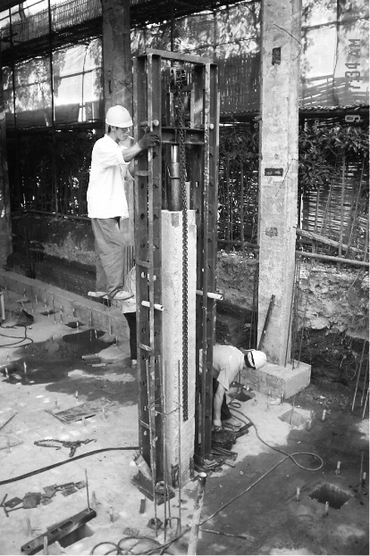改扩建工程结构完成3层以后,当基础有足够的荷重时,在建筑物自重作用下方可开始在基础上进行压桩施工。正式压桩之前选择2根桩作为试桩,以确定压桩力大小。正式压桩的施工要点如下: