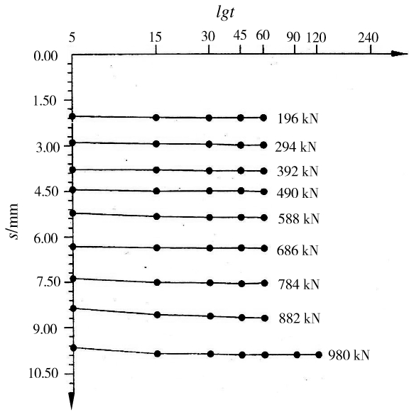 本工程压桩力均在900~1 280 kN之间,按设计要求,对6套(根)桩作了静载试验,均满足单桩极限承载力大于960 kN的设计要求,检测结果见表1,Q-s曲线和s-lgt曲线如图6、图7所示。
