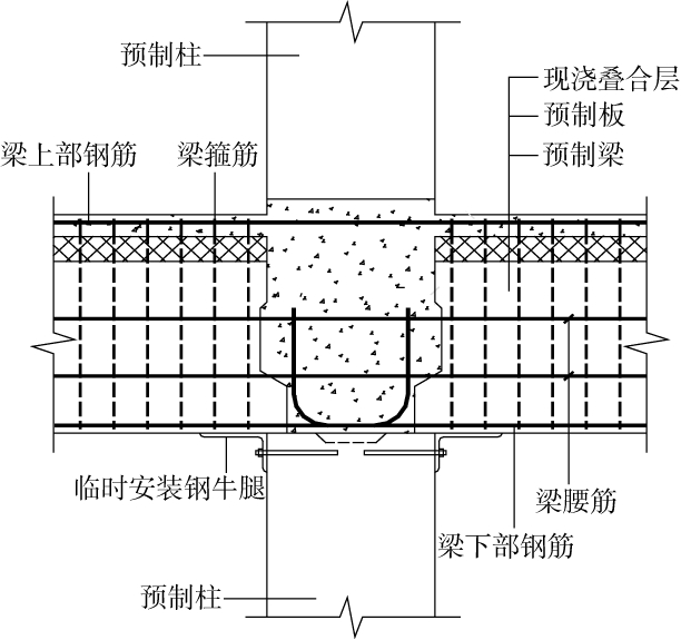 本项目设计中需要解决的主要是预制构件的连接接头问题,接头包括现浇柱与预制柱的连接、预制柱与预制梁的连接、预制主次梁间的连接及叠合板与预制梁的搁置节点等4大方面。连接接头根据结构的受力性能和施工条件,并能保证结构的整体性进行设计,且构造简单、传力直接。同时考虑到施工和使用过程中的温差和混凝土收缩等不利影响,适当增加构造配筋,避免有构件出现局部削弱而引起应力集中,构件接头接缝浇筑采用C40细石混凝土。