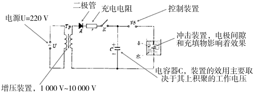 放电冲击破碎的理论来源于1955年俄罗斯的尤特金提出的高压放电脉冲破碎理论,其系统电路原理如图4所示。