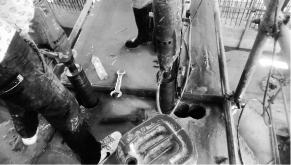 静力破碎安静无污染、施工方便,但是静力破碎法需要一定的时间(8~12 h)让膨胀剂产生膨胀作用力,而且在静力破碎之前还需割断剔除面筋、箍筋,静力胀裂过后还需用小风镐人工破碎清理,重复产生工作量,耗费大量时间,影响工期。