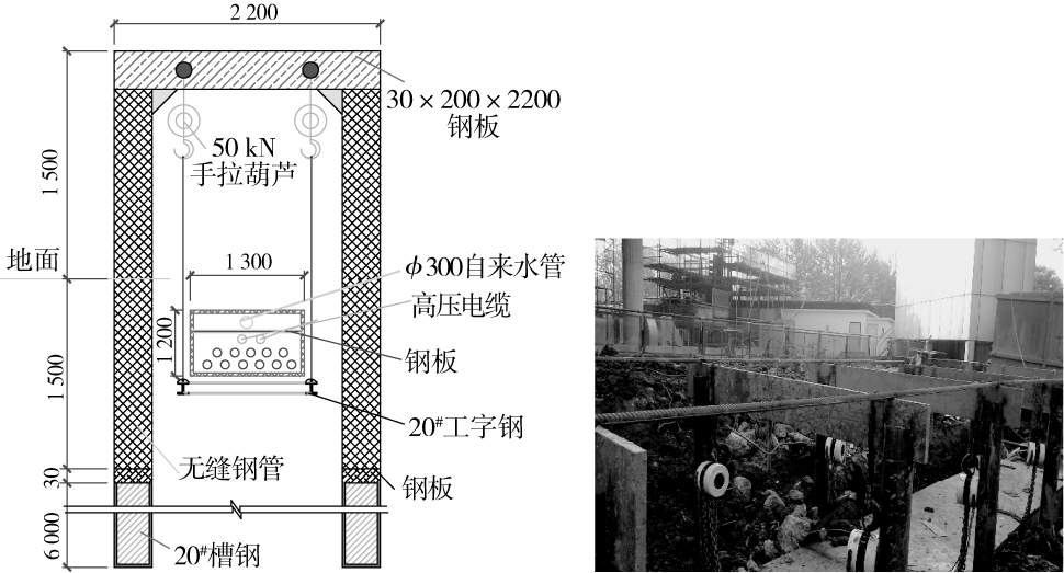 2)采用挖机等设备在信息管线两侧打设20#槽钢,深6 m,间距1.5 m,每个点位打设2根。槽钢顶部平铺焊接30 mm×200 mm×1 300 mm钢板拉通,钢板上部焊接加工成型的无缝钢管龙门架,龙门架由φ160 mm×5 mm×3 000 mm无缝钢管和30 mm×200 mm×2 200 mm钢板组成,龙门架共计13组。为确保龙门架安全、牢固,在安装结束后,龙门架顶部采用2根φ25 mm钢筋连成整体,以加强龙门架的稳固性,确保管线安全。每榀龙门架上安装2个50 kN手拉葫芦用于牵拉管线,采用20#工字钢作为托架,托住信息管线,扁担按照1.5 m间距进行布置(图2)。