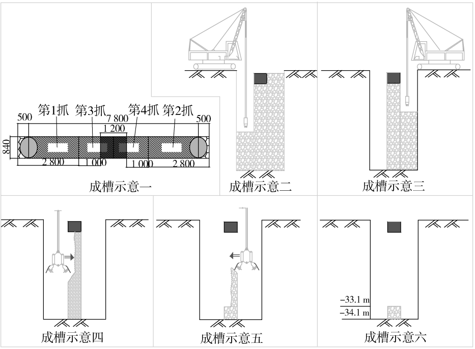 3)由于此段钢筋笼须分2幅进行吊放,钢筋笼吊放至槽段后需进行横向移动,故成槽时深度必须加深0.5~1 m(图3)。