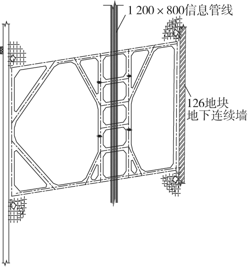 根据勘察,沿济南路方向有一信息电缆箱涵横穿整个连通道基坑,电缆箱涵宽1.2 m,高0.8 m,埋深1.8 m,内有光缆、铜缆共30孔。在信息管线上方另有1根φ300 mm的自来水管和2根高压电缆。施工期间此电缆管线不能进行搬迁,因此在地下通道施工时应采取相应的保护措施。在信息管线区域进行桩基、地下连续墙及土方开挖施工时需采取有针对性的防护措施(图1)。