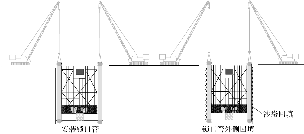4)钢筋笼下放完成后,进行锁口管的吊放。在锁口管吊放完毕后,锁口管外侧的空余部位回填瓜子片等,然后同时启动钢筋笼内预留的油缸,使2片钢筋笼紧贴。