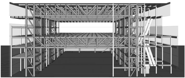 本工程1层结构面以上至屋面基本为全钢结构,结构的南、北两侧为全钢的框架柱、梁的核心筒结构,作为整个结构的支承基础体系,在框架结构的纵向及横向设置相互交接的竖向支撑,以增强整个结构的四向刚度。结构的跨中为54 m的大跨度纵向桁架,根据结构的受力及使用要求,在相应部位设置楼面桁架、屋面桁架,局部形成双层桁架,纵向桁架支承于两侧的框架结构(图1)。