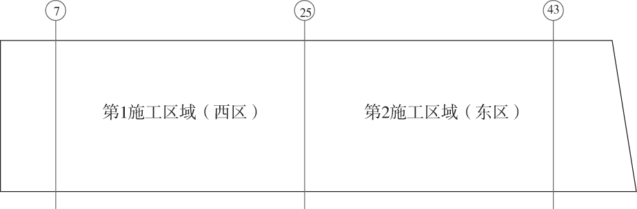 本工程钢结构施工工作量大,工期紧迫,根据结构分区及前道工序施工流水,结合钢结构施工特点,将工程划分为2个区域同时进行施工:第1施工区域(西区)为7轴~25轴,第2施工区域(东区)为25轴~43轴(图2)。