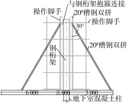 2)拼装场地:拼装主要在1层楼面进行,而1层楼面有承载力的限制(5 kN/m2),因此需要在拼装时将桁架直接支承在立柱顶端上。由于采用原位拼装,因此在对应提升轴线下均需划拨相应的拼装场地。