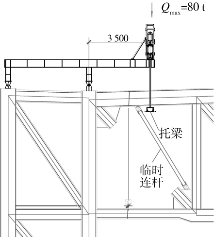 本工程桁架跨度大,片状式桁架高度大而宽度窄,结构形式限制了片状式大跨度桁架整体拼装后同步提升的条件。为了解决在单榀桁架提升过程中,桁架的上弦由于轴心受压而产生的平面外失稳,在片状式大跨度钢架的顶面设置装拆式水平桁架,增加上弦宽度,以此增大桁架侧向惯性矩,解决了单榀桁架提升平面外失稳的难题(图7)。