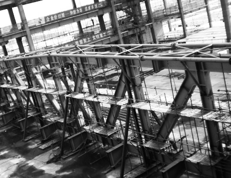 背景工程的南北两侧结构主要为由柱、梁组成的框架式结构,中间部位为数榀长度为54 m的桁架,作为主要受力构件。