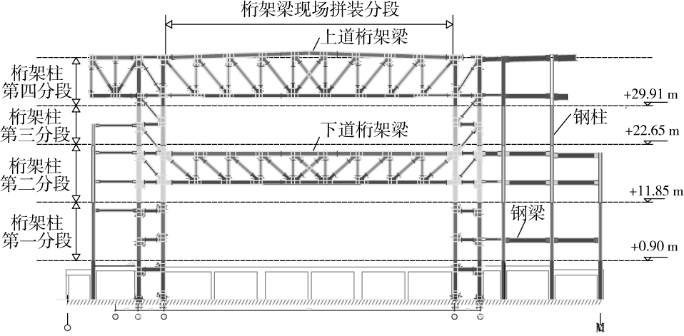 考虑到吊装设备的性能,桁架柱地上部分沿高度方向分为4段单根吊装,其中最大质量约23 t;框架柱地上部分沿高度方向分为4段,其中最大质量约9 t。
