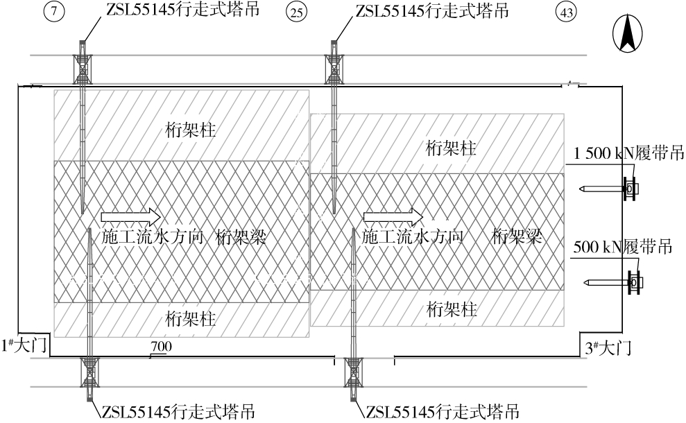 从7~43轴共长324 m,安装构件较多,桁架柱和框架柱单根吊装至安装位置,桁架梁散件吊装至现场拼装成整体后提升,质量较大,吊装半径又大,所以西区(7~25轴)与东区(25~43轴)分别选用2台ZSL55145型行走式塔吊,并分别布置在南北两侧的基坑外,使吊装区域可以覆盖整个施工区域。另布置1台KH700(1 500 kN)履带吊、2台QUY50A(500 kN)履带吊、2台500 kN汽车吊分别负责ZSL55145行走式塔吊的装拆、地下室劲性柱的安装,构件驳运以及地脚螺栓的安装。