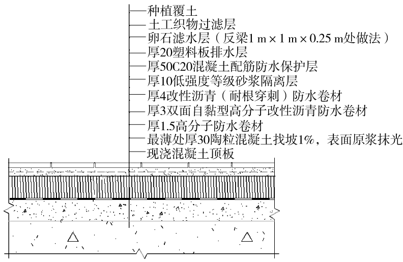 本工程种植顶板面积较大,为反梁结构,施工难度大,必须从设计方案选定、材料选择、施工等多方面综合研究考虑,既要保证地下室顶板景观植物培育生长,同时需要保证顶板排水顺畅不渗漏,以满足建筑物的使用功能[4-6]。