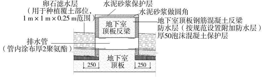 3)种植土下部设置排水板及土工织物,根据地下室顶板反梁形成的方格,每8~16个方格布置1个落水斗,各方格之间的反梁预留水平排水管。种植顶板排水采用2道措施,一部分雨水通过地下室顶板表面排走,另一部分渗透进土壤的雨水通过种植土下部的排水板排至落水斗,从地下室排出。