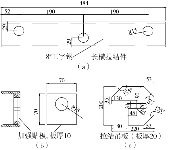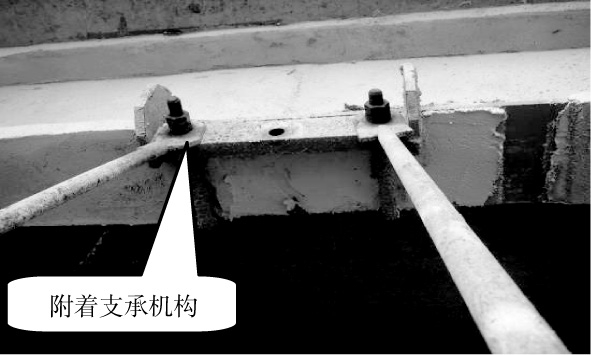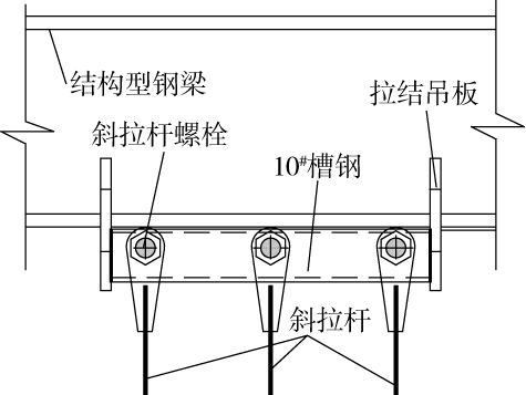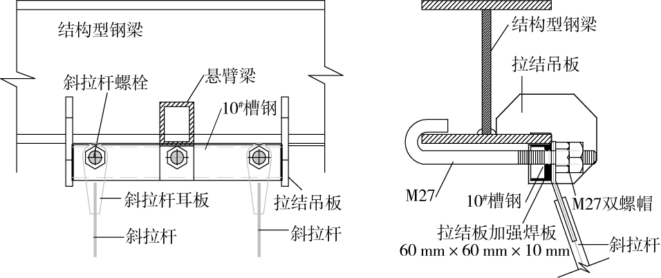 附着支承机构由弯钩单头螺杆、连接板槽钢、U形挂板、结构型钢梁、双螺母、加强侧板、悬臂梁、斜拉杆、斜拉杆耳板组成。利用连接板槽钢两端与U形挂板焊接连接,U形挂板U形开口处挂在结构型钢梁下翼缘上,弯钩单头螺杆弯钩端吊挂在结构型钢梁,另一端穿过连接板槽钢预先设置的连接圆孔,连接板槽钢开口方向腹板处衬加强侧板,斜拉杆与耳板通过双螺母与弯钩单头螺杆固定在连接板槽钢上,悬臂钢梁一端焊接钢板并预先留设连接圆孔与弯钩单头螺杆通过双螺母固定在连接板槽钢上(图5),加强侧板与连接板槽钢采用焊接连接[3]。