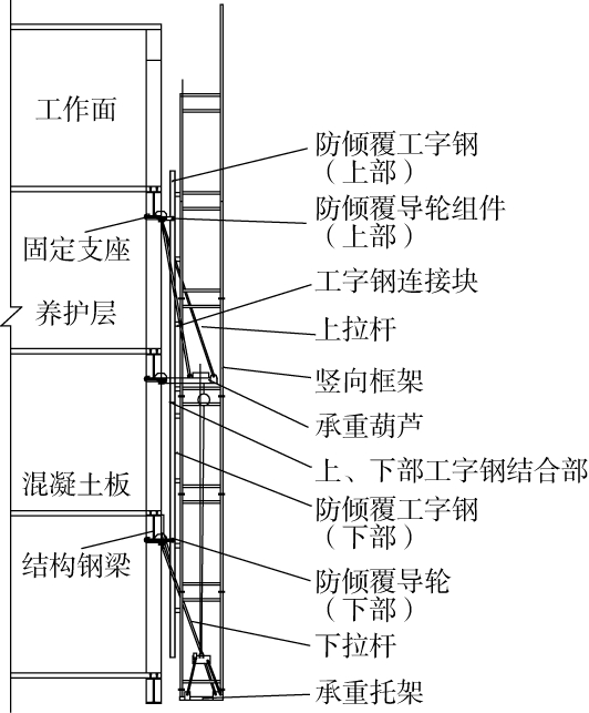 中心提升式附着升降脚手架由附着支承机构,架体系统,提升控制系统,防坠、导向防倾安全控制装置,同步控制系统,电动葫芦组成。架体系统由竖向框架及水平桁架组成。提升控制系统主要由吊拉杆、升降钢梁、荷载传感器组成,电动葫芦为低速环链,额定起重质量不少于7.5 t,升降速度不大于0.20 m/min,电控柜具有点控、群控、急停功能,配置过载、过流的安全保护装置,具有短路及缺相漏电保护功能。防坠安全控制装置由防坠拉杆、防坠杆、防坠落安全锁组成,采用与同步控制系统监控反馈联动[1,2]。导向防倾安全控制装置由专用导轨和滑轮组成,导向防倾安全控制装置与结构固定支座由槽钢及钢板夹片组成,中心提升式附着升降脚手架构造如图1所示。