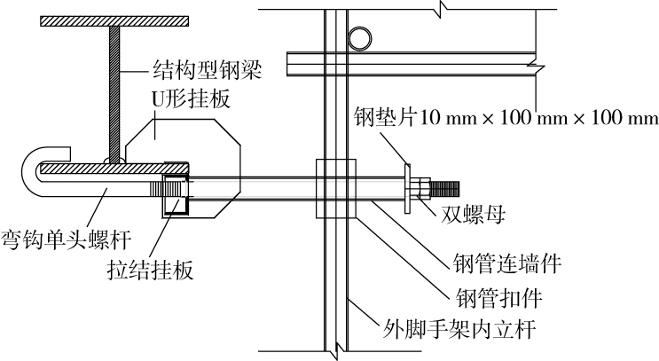 将承重托架的2根下拉杆与建筑物连接,安装好临时拉结,并将架体底部防护到位。松开电动葫芦链条,松动并脱开上部承重支架的斜拉杆及上部承重支架上的螺栓,用手拉葫芦将整套提升设备升至下次提升所需位置[4]。整体脚手架交付施工使用时,必须安装临时连墙件,连墙件由弯钩单头螺杆、拉结挂板、U形挂板、结构型钢梁、双螺母、垫片、钢管连墙件、钢管扣件、外脚手架内立杆组成,主要利用拉结挂板设置拉结孔,拉结挂板一端与U形挂板焊接连接,U形挂板在U形开口处挂在结构型钢梁下翼缘上,弯钩单头螺杆弯钩端吊挂在结构型钢梁,另一端穿过拉结挂板预先设置的拉结孔,弯钩单头螺杆穿过拉结孔后再伸入作为连墙杆φ48.3 mm×3.6 mm钢管,钢管与拉结挂板顶紧,并与外脚手架内立杆通过钢管扣件连接,钢管外侧端部用钢板垫片与弯钩单头螺杆采用双螺母进行紧固(图8)。