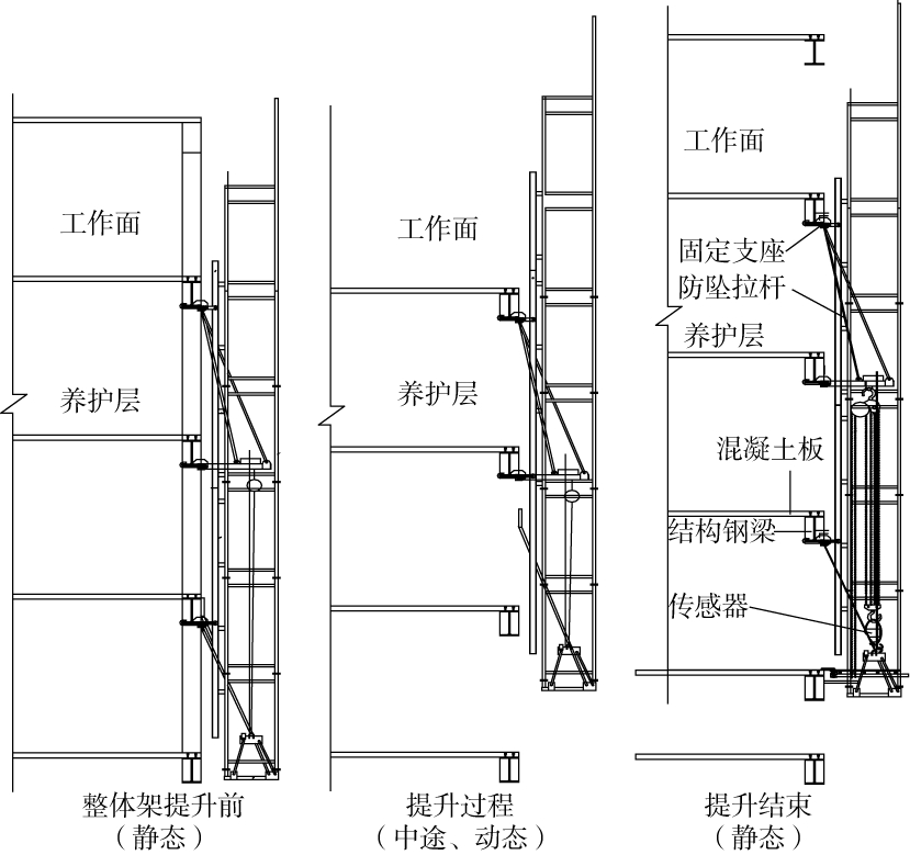 中心提升式附着升降脚手架通过特殊附着装置附着于结构钢梁上,满足了附着架自身质量、架体承载力及稳定性要求,有效地解决了高层建筑钢框架非压型钢板组合楼盖结构施工的安全围护问题,具有节约钢材、节约工期、节约成本等优点[5]。
