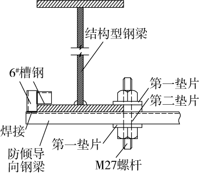 3)中心提升式附着升降脚手架导向防倾安全控制装置通过防倾导向件固定装置将其固定在结构钢梁上,在槽钢一端用2根短槽钢焊接成水平放置的U字形卡件卡在结构型钢梁下翼缘上,槽钢接近中间部位采用螺栓加垫片固定在结构型钢梁下翼缘上,使防倾导向件牢固地固定在结构型钢梁上(图4)。
