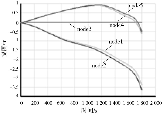 支座截面的5个测点的挠度-时间曲线如图11所示。在1 200 s以前,上翼缘的测点由于热膨胀位移向上,下翼缘的测点向下膨胀。而跨中测点3位于支座处,位移为零。在1 200 s以后,上翼缘位移开始向下,而下翼缘向下的位移明显加快。这是在升温过程中,梁的变形主要由热膨胀转变成主要是由材料的刚度颓坏引起。