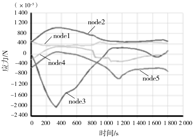 这5个点沿轴向的应力随时间的关系如图13所示。正值表示拉应力,负值表示压应力。升温开始后,由于下翼缘靠边缘测点1和腹板中部测点3辐射角系数大,受空气的辐射、对流作用强,升温较快。上翼缘和翼缘与腹板交接处的测点2、4、5升温较慢。测点1、3温度高,受热产生膨胀,测点2、4、5会约束其膨胀,故在测点1、3中产生膨胀压应力,测点2、4、5产生膨胀拉应力。所以在升温一开始,测点1、3应力降低,而测点2、4、5应力增加。随着温度的增加,截面温度分布趋于均匀,膨胀也趋于均匀,各点的应力也向初始时刻的应力靠近[5,6]。