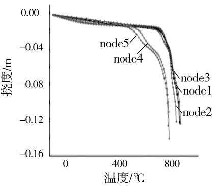 跨中截面5个点的挠度-温度曲线如图10所示,虽然同一截面各点的挠度-时间曲线差别不大,但是由于同一截面温度有一定的差别,故各点的挠度-温度曲线有较大的差别,同一挠度下,上翼缘测点4和测点5的温度比其他测点低,最大值达200 K。同一温度下,上翼缘的挠度比其他点高。在该图也可以看出,测点4的最终挠度在比同一截面的其他点的挠度大。