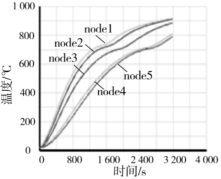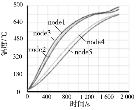 由于截面温度分布不均,为了较全面地表示截面的温度-时间曲线,在三面受火钢梁上选择了如图4所示的5个点,这5个点的温度-时间曲线如图5所示(测点1对应于ANSYS中的node1,依次类推)。在三面受火钢梁的跨中截面,不同点的温差较大,随着空气的温度升高,下翼缘和腹板升温明显快于上翼缘。在1 000 s左右时温差达到最大,差值为300 K。随着构件温度升高,空气与构件温差变小,热量在构件中的热传导作用加强,温度逐渐趋于均匀。