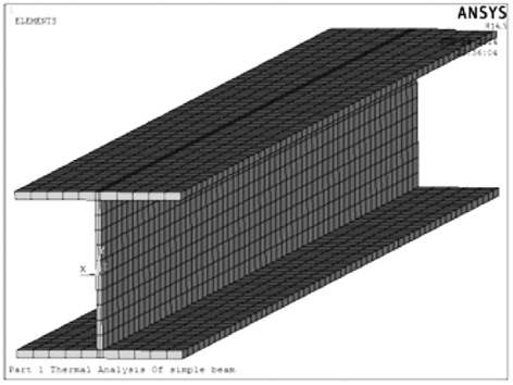 温度场采用solid70单元进行热分析,此单元是具有1个自由度的八节点六面体(Brick8 node70),结构分析中转化为solid45单元。首先把模型沿梁长分成60段。腹板沿厚度分成2层,沿宽度分成10段。翼缘沿厚度分成1层,沿宽度分成12段。如图1所示。