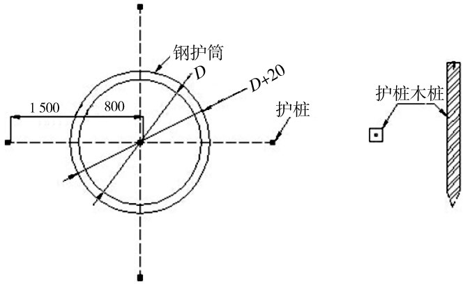 沿桩中心呈十字形引出4个桩位点用来控制桩位,单桩护桩采用木桩(3 cm×3 cm),桩顶钉钉,高度80 cm,埋入地下45 cm,并用砂浆或素混凝土保护(图3)。