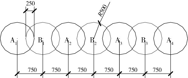钻孔咬合桩在设计施工上连续排列,但相间桩分A型桩和B型桩,A型桩为无钢筋笼的素桩,B型桩为有钢筋笼的混凝土桩,先施工2根A型桩,再施工中间的B型桩,如图2所示,施工顺序为A1→A2→B1→A3→B2→A4→B3。